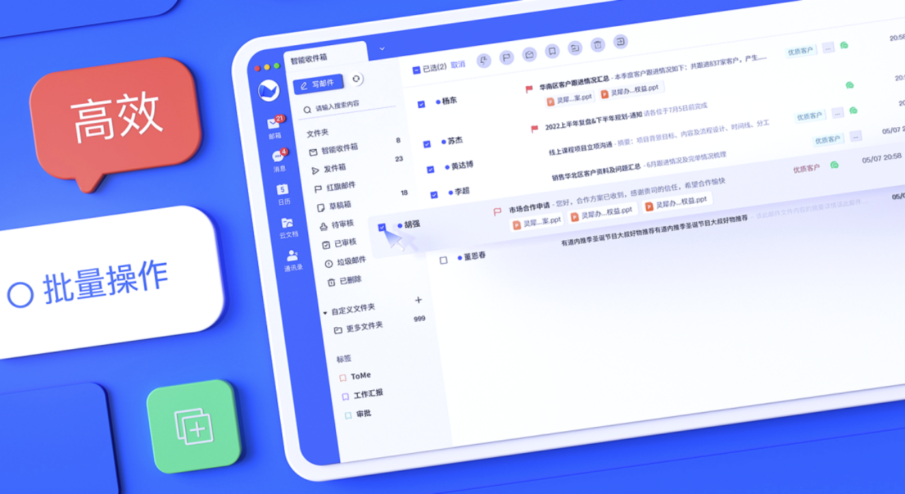 網易靈犀辦公新增郵件(jiàn)批量操作(z±☆§uò)方式,用(yòng)戶可(kě)快(kuài)捷處理(lǐ)批量選中的(de)郵件(jiàn),效率翻倍。同時(shí),可(kě)支持批量導出、标記郵件(jiàn&±),方便用(yòng)戶在設備上(shàng)進行(xíng)備份、二次÷<πε導入到(dào)其他(tā)郵件(jiàn)客戶端。
