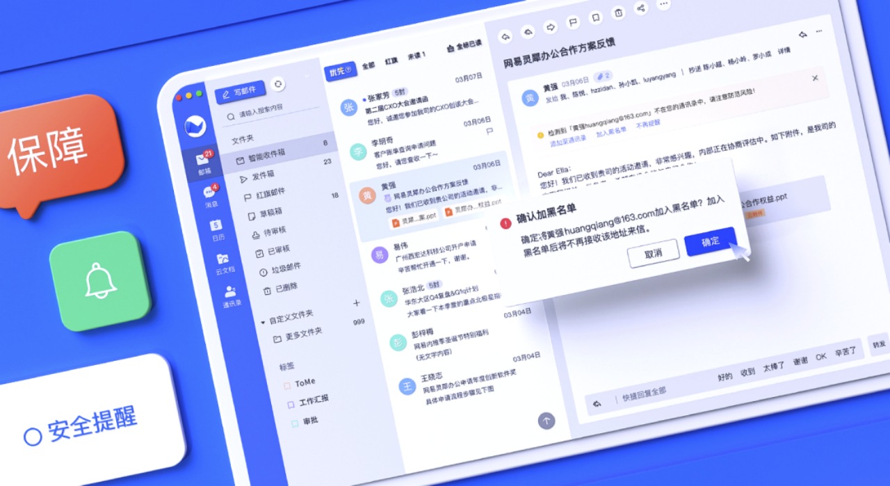 如(rú)果發現(xiàn)陌生(shēng)郵件(jiàn)地(dì)址有(yǒ→•u)風(fēng)險,可(kě)以在讀(γdú)信場(chǎng)景将陌生(shēng)©←↑郵件(jiàn)加入黑(hēi)名單,一(yī)鍵阻斷風(fēng)≠£♠↕險地(dì)址的(de)再次來(lái)信;郵件(jiàn)回複時(shí)φ×,也(yě)可(kě)一(yī)鍵移除陌生(™÷shēng)郵件(jiàn)地(dì)址。
