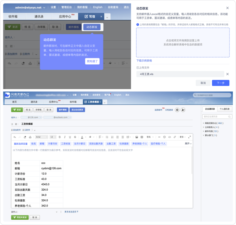 網頁版郵箱全新推出動态群發功能(néng),在群發個(gè)性化(huà)信息時(shí),例如(rú)工(gōng↑<∏)資單,點擊「動态群發」後可(kě)上(shàng)傳提前編輯好(hǎo)的(★©de)表格,在表格中将信息與指定的(de)人(rén)員(✔₽£yuán)、郵箱進行(xíng)對(duì)應,系統将根據表格中的(de)₹信息自(zì)動生(shēng)成對(duì)應每個(gè)收件(jiàn)人(✘•<≤rén)的(de)個(gè)性化(huà)郵件(jiàn)內(nèi)容并定向發送,由此便能(néng)給企業(yè)的(de)相(xià♦∑ng)關部門(mén)節省時(shí)間(jiān),大(dà)大(dà)提高(gā₽™♥$o)辦公效率。