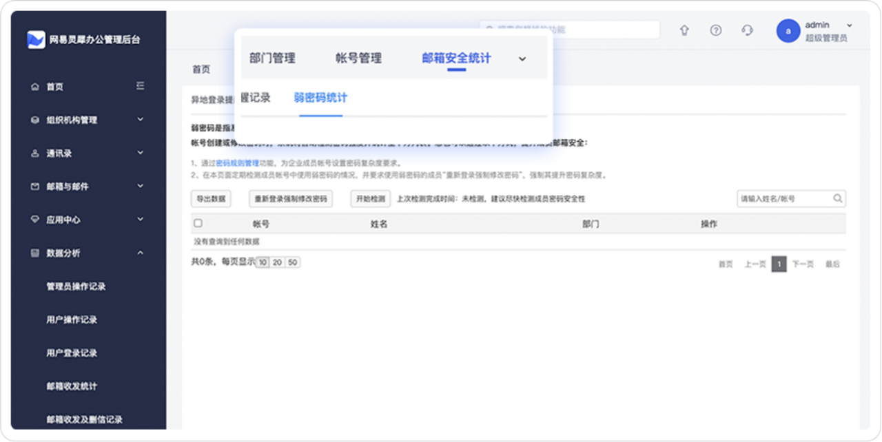 管理(lǐ)員(yuán)可(kě)在後台手動排查企業(yè)中使用(yòng)弱密碼的(de)郵箱帳号并發送通(tōng)知(zhī),提醒弱密碼使用(yòng)者修改完善密碼,以此提高(gāo)郵箱帳号的(d§≥e)安全性,保護數(shù)據、信息等企業(yè)财産。
