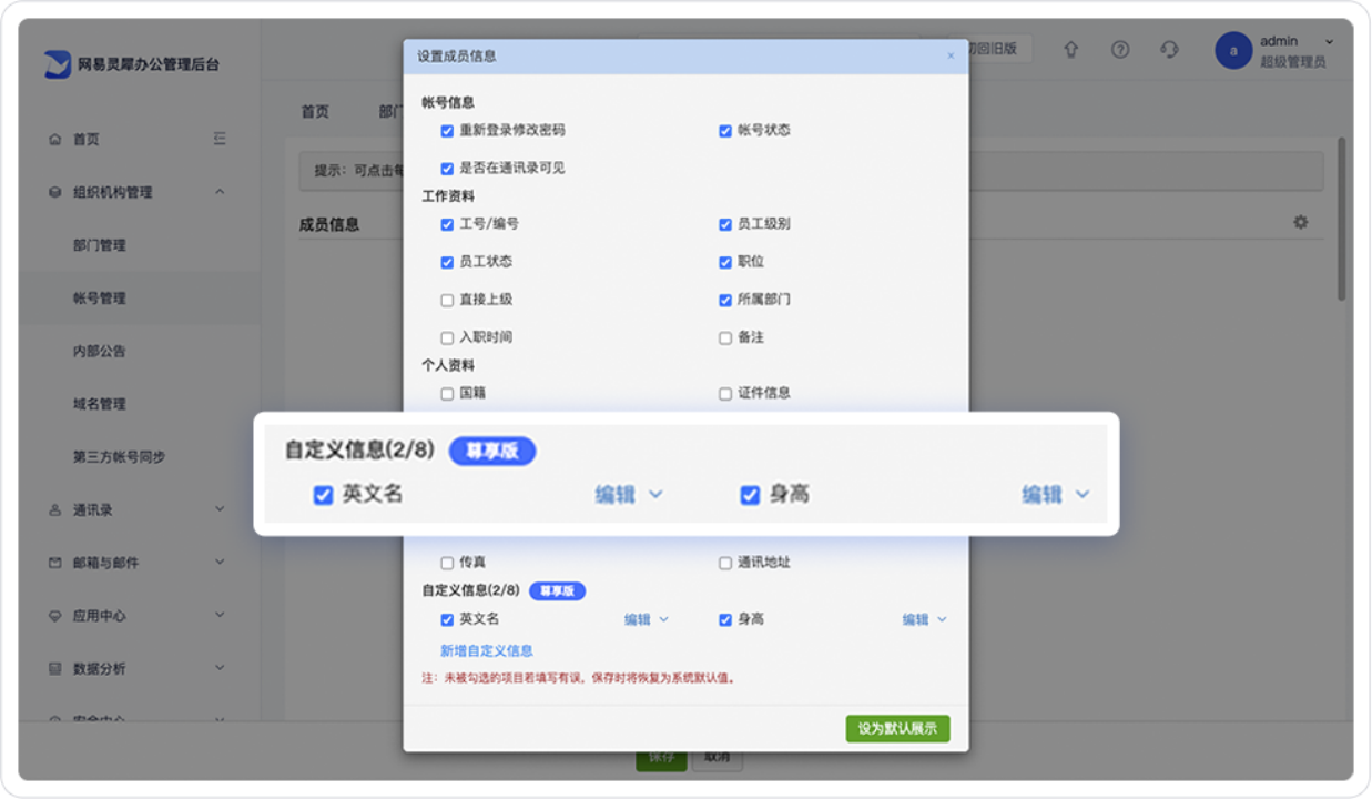 在企業(yè)日(rì)常運行(xíng)中,出于管理(lǐ)需求,員(yuán)工(gōng)的•↕π(de)個(gè)人(rén)信息展示也(yě)會(huì)作(zuò)出相(xiàng)應調整。網頁版郵箱尊享版支持企業(yè)管理(lǐ)員(yuán)根據需求對(duì)員(yu£≥$₹án)工(gōng)郵箱帳号信息進行(xíng)自(zì)定義修改,例如(rú),在原有(yǒu)的(de)姓名、郵箱展示基礎上(shàng),管理(lǐ)員(yu↕≈δ'án)可(kě)按需添加員(yuán)工(gōng)的(de)英文(wén)名展 ☆↕示,以此滿足企業(yè)的(de)管理(lǐ)需求,修改後的←∑(de)信息還(hái)可(kě)同步到(dào)簽名等內(nèi)容中,滿足企業(yè)規÷Ω範化(huà)、統一(yī)化(huà)管理(lǐ)✘λ♥要(yào)求。通(tōng)過支持管理(lǐ)員(y∏σ§uán)個(gè)性化(huà)修改和(hé)¶§展示帳号信息,幫助企業(yè)更好(hǎo)地(dì)達成♦'管理(lǐ)目标。