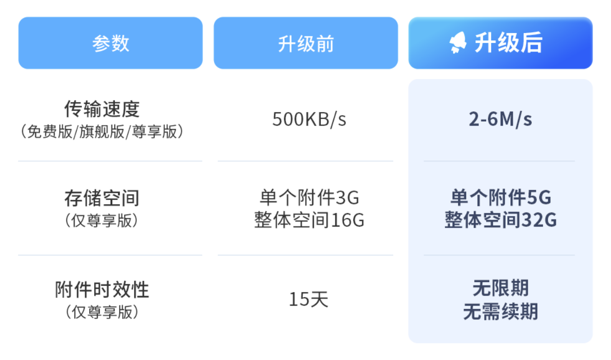 雲端信息存儲是(shì)企業(yè)及員(yuán)工(gōng)常用♣×¥&(yòng)的(de)存儲方式,高(gāo)速的(de)傳輸速度和(hé)龐大(dà)的(de) ®"存儲空(kōng)間(jiān)則為(wèi)雲端存儲提供了(le)極大(dà)的★σ(de)便利和(hé)效率。通(tōng)過'σ←•雲附件(jiàn)的(de)升級,将傳輸速度由500KB/s提升至 2-6M/s,極大(dà)提升傳輸效率;尊享版在提升傳輸速度的(de)同時(shí),對(duì)存儲空(kōng)間(jiān)也(yě≤β)做(zuò)了(le)擴容升級,單個(gè)附件(jiàn)大(dà)小(xiǎo)由3G提升至5G,整體(tǐ)存儲空(kōng)間(jiān)由16G提升至32G,"€且附件(jiàn)永不(bù)過期,無需續期。開(kāi)通(tōn₹π©g)尊享版,即可(kě)暢享高(gāo)速傳輸★ "和(hé)無憂存儲。