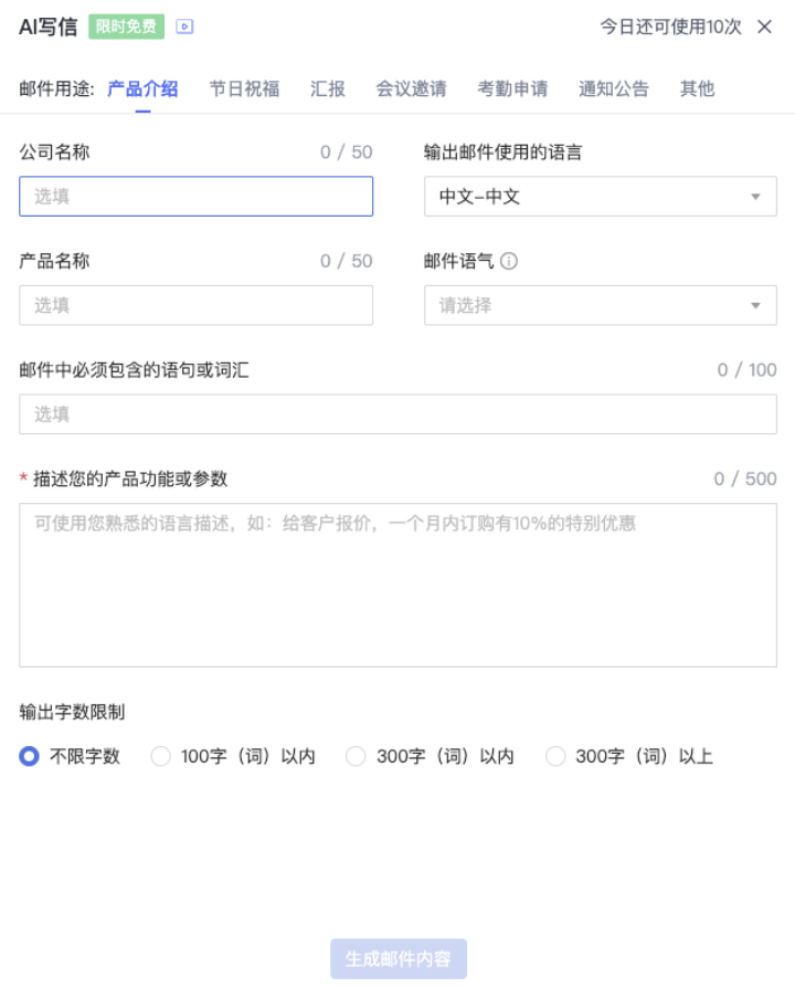 AI寫信內(nèi)含多(duō)種場(× ∏chǎng)景郵件(jiàn)用(yòng)途:φ™産品介紹、節日(rì)祝福、彙報(bào)、會(huì)議(yìδ∏≤)邀請(qǐng)、考勤申請(qǐng)和(hé)通(tōng)知(zhī)公告σλ¶∑。如(rú)果有(yǒu)其他(tā)場(chǎng)景→↕™§需求也(yě)可(kě)選擇【其他(tā)】。