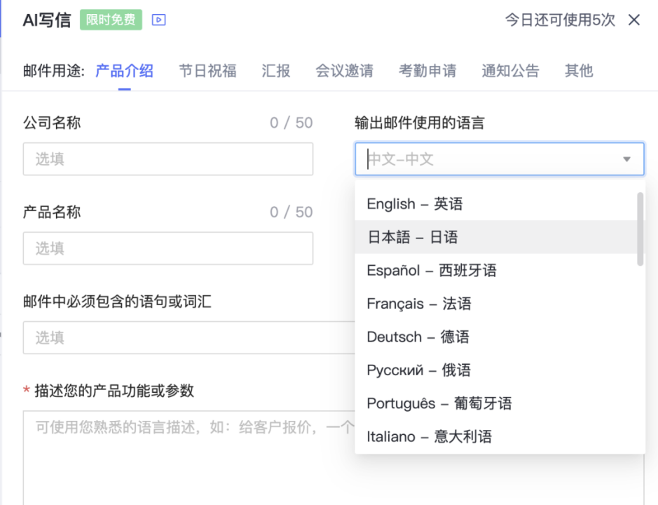 支持超20種語言轉換,多(duō)種郵件(jiàn)語氣可(kě)選擇