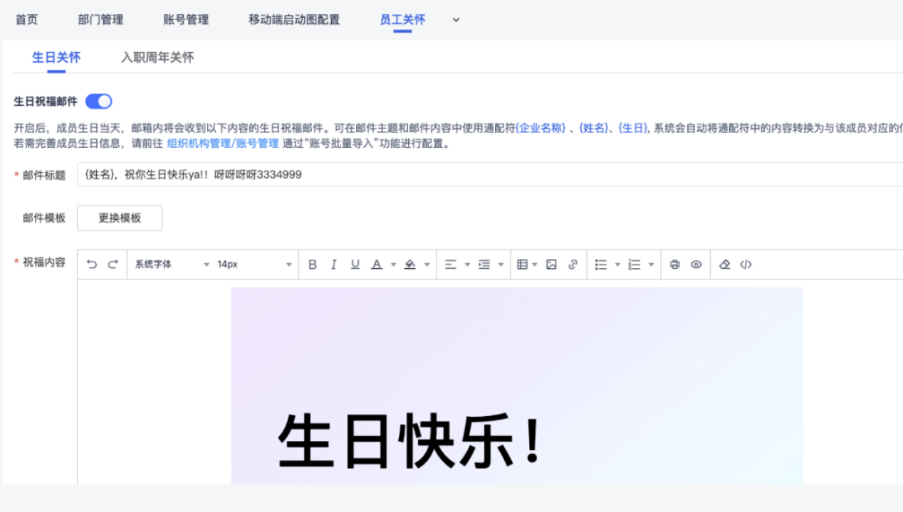 統一(yī)郵箱認證:方便信息安全管理(lǐ),對(duì)郵箱→♣進行(xíng)認證,有(yǒu)效防僞,防止冒充員(yuán)工(gōng)生(shēng)日(rì™↕ε)、員(yuán)工(gōng)入職周年(nián)祝福郵件®→¶ (jiàn):在員(yuán)工(gōng)生(shē∑γεng)日(rì)時(shí),系統可(kě)根λφ£∏據員(yuán)工(gōng)信息及企業(yè)¶✔←₩模闆,給員(yuán)工(gōng)發送生(shēng)±"日(rì)祝福郵件(jiàn)