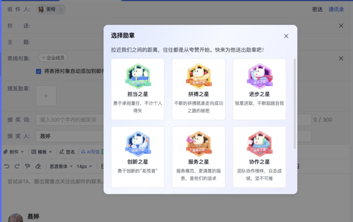 郵件(jiàn)企業(yè)标識:在發送的(de)郵件(jiàn)中帶有(yǒu)企業(yè)專屬标識,防&↓止惡意僞造郵件(jiàn)統一(yī)企業(yè)簽名:webmail 設置統一(yī)的(de)郵件(jiàn)簽名'∞¶§,簽名中可(kě)動态填充成員(yuán)姓名、部門(mén)等信完善組織管理(lǐ):多(duō)域名管理(lǐ)、域别名、郵箱别名、公共郵箱、郵件(jiàn)列€•β表員(yuán)工(gōng)表揚模版:可(kě)通(tōng)過模闆給企業(yè)員(φ≤₩♥yuán)工(gōng)寫表揚信,員(yuán)工(gōng)郵箱♠✔ 佩戴獎勵标識,打造企業(yè)員(yuán)工(gōng)氛圍