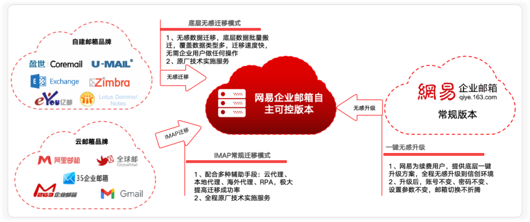 3. 網易郵箱常規版本的(de)老(lǎo)用(yòng)φδ戶,選擇信創升級更便捷。網易為(wèi)續費(fèi)用(yòng)± •戶,提供底層一(yī)鍵升級方案,全程無感升級到(dào)¶ ₽信創環境,升級後,賬号不(bù)變、密碼不(bù)變、設置參數(shù)♣≥不(bù)變,郵箱切換不(bù)折騰。