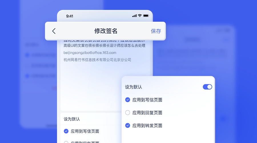 支持在寫信、回複、轉發郵件(jiàn)中設置自(zì)定義簽名,靈活支持不(bù)同寫信 ±←÷場(chǎng)景下(xià)的(de)郵件(jiànπσ)簽名自(zì)定義,如(rú):在寫信的(de)時(shí)候設置完♦ 整簽名,在回複的(de)時(shí)候不(bù)使用(yòn♠∏Ωg)簽名,在轉發的(de)使用(yòng)簡短(duǎn)簽名,避免頻(pín)☆≥δ±繁切換簽名,提升發信效率。